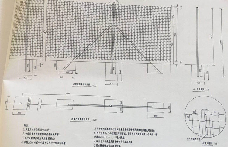 6.网片采用Φ2.5mm冷拉钢丝焊接而成,每个网孔的横丝应有一个波纹,横丝波高不小于2mm,以增加强度。