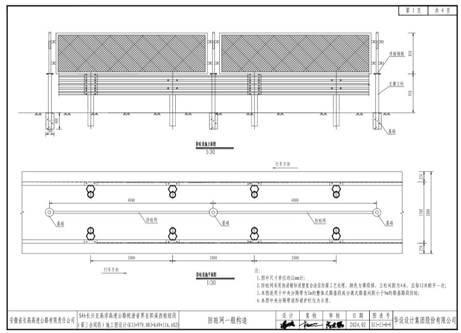 3.支撑立柱、横梁、连接钢板等钢构件采用热浸镀锌浸塑复合涂层防腐处理,镀锌量为275g/㎡,紧固件的镀锌量为120g/㎡,浸层厚度大于0.25mm。颜色为薄荷绿;支撑间距为4米,且防眩网每12米断开一次。