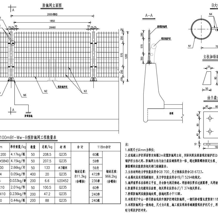 9.本图防抛网为一般构造,尺寸为示意,施工前应现场准确测量现状护栏尺寸,再对防抛网布置进行调整,避免安装时与现状护栏冲突。