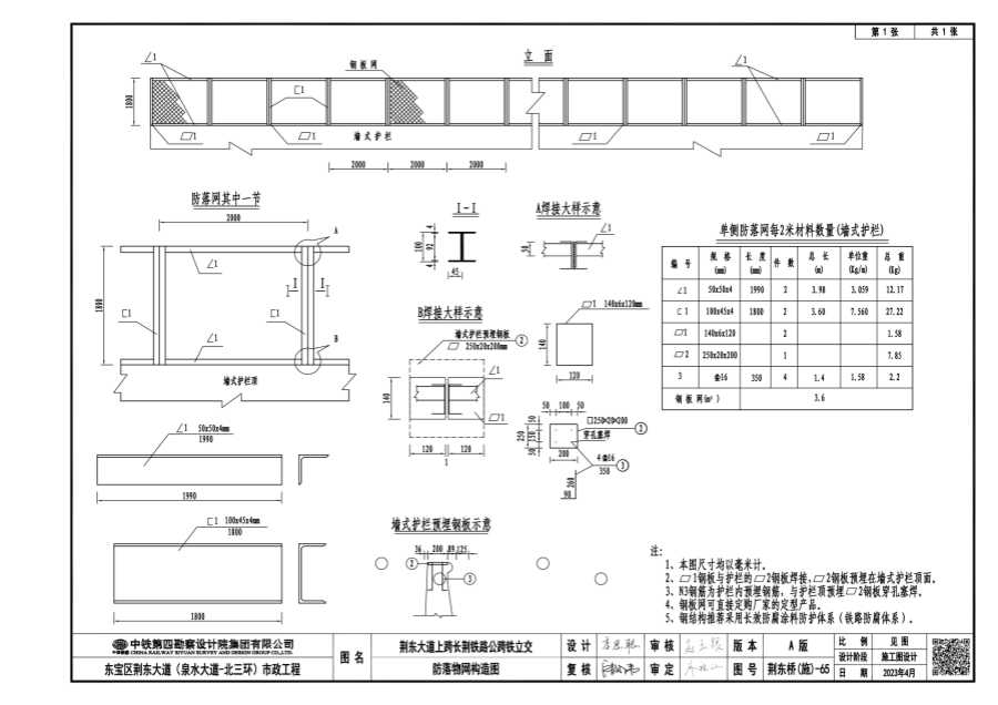 全桥范围桥面两侧均设置防抛网,避免桥上抛物,不利于铁路安全。防抛网设置在外侧HA级防撞墙墙顶上,顶面高出人行道不小于2.5m。防抛网格栅采用2m一段的金属网、直径不小于6mm的钢丝,网眼不大于2.5cm,钢丝网表面采用热镀锌+浸塑处理,热镀锌量 270g/㎡,浸塑厚度0.8~1.2mm,浸塑颜色为墨绿色。防抛网上设置“高压危险”警示标志。