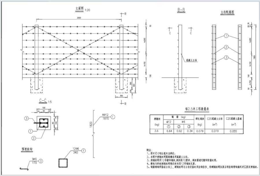 2.本图中刺钢丝网隔离栅将采用混凝土立柱。