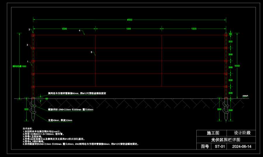 6.采用螺旋钢桩φ48x2.5mm长550mm露头50mm,φ42刺绳柱与预埋钢管插接80mm,用M12对穿防盗螺栓固定。