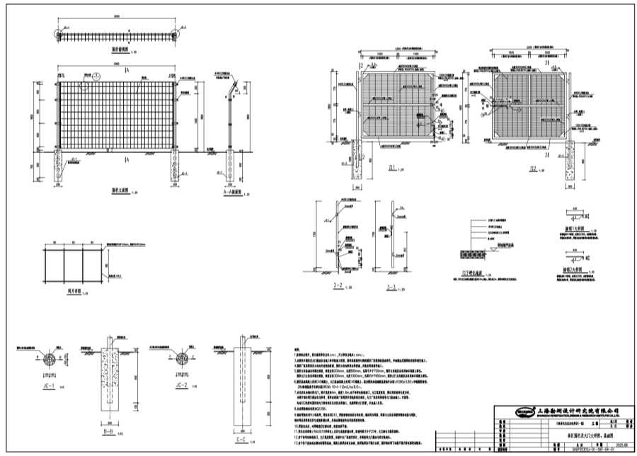 2.本图所示围栏及大门做法仅为施工参考的施工图案,最终应根据所订购的围栏厂家提供的基础形式,详细做法及围网的花型等进行施工。