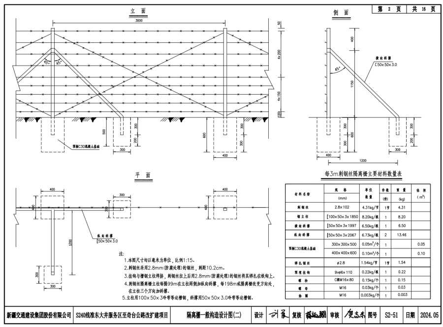 4.刺钢丝隔离栅立柱每隔99m在立柱两侧加纵向斜撑,每198m或隔离栅改变方向处,在立柱三个方向加斜撑。