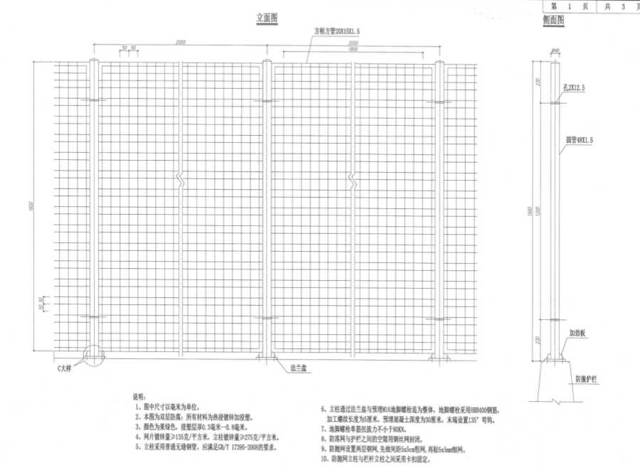 4、防抛网设置在第一跨左右幅外侧防撞护栏上,长度为下穿公路(龙水路)的边界沿上跨桥走向向外侧延长不小于10m,防抛网立柱与栏杆立柱对应安装,全桥合计防抛网52米,共计26片。